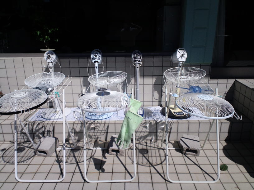 カバーを外して、羽をとって、洗剤で洗って、本体は濡れたぞうきんで拭いて、両方とも天日干し。ひと夏お疲れ様だした(画像に写ってないものもあり)。