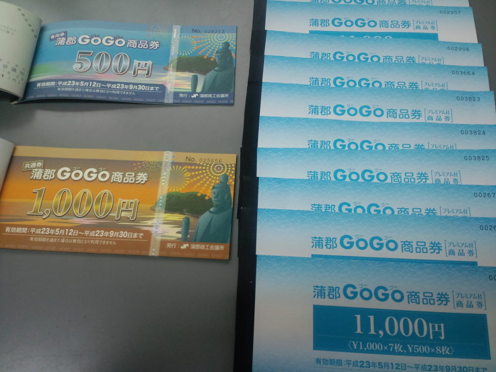 500円券8枚=4000円、1000円券7枚=7000円で合計11000円分の商品券を10000円で販売。